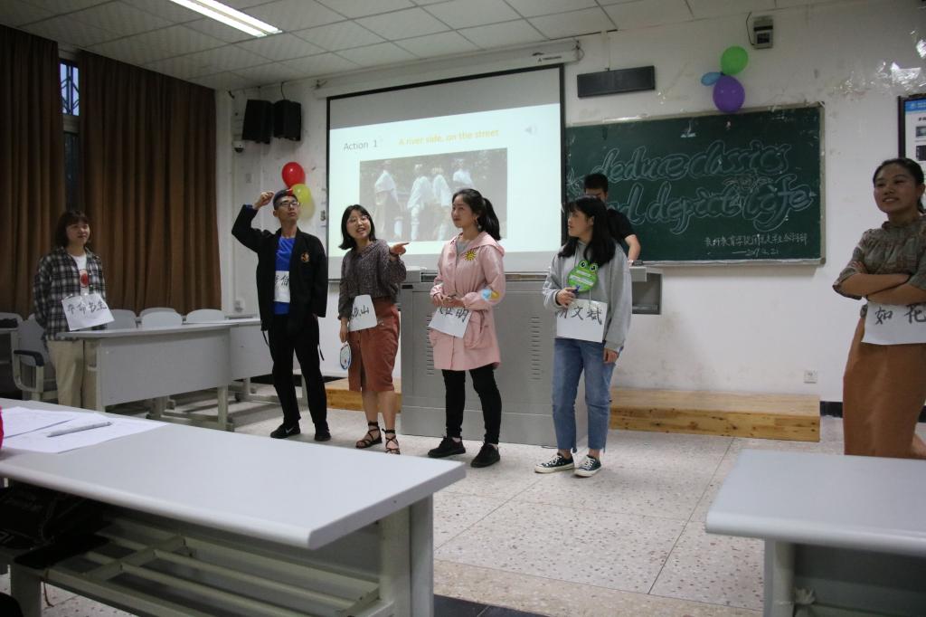 活动伊始,主持人以中英结合的方式,对本次比赛的主题内容进行阐述,并介绍到场的各位团学干部。精彩纷呈的舞台剧表演在主持人慷慨激昂的介绍下拉开序幕。参赛选手以班级为单位陆续登场,并用精彩绝伦的演出和地道流利的口语赢得了观众的声声喝彩。在激动而又兴奋的气氛下,主持人带领同学们观看英语励志短片。让同学们在学英语的同时,也领悟到了不惧失败,迎难而上的真谛。随后主持人宣读获奖名单并合影留念。至此,活动圆满结束。