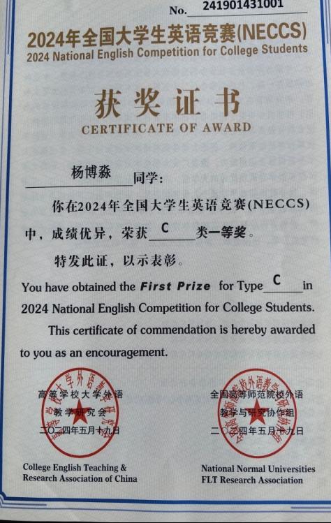 在“2024年全国老员工英语竞赛”中,杨博淼同学获得一等奖, 喻婷等同学获得二等奖。