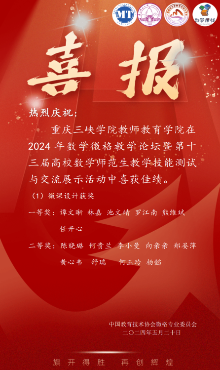 在“第十三届高校数学师范生教学技能测试与交流展示活动”中,谭文晰、林嘉、池文靖等同学获得一等奖,陈晓璐、何贵兰等同学获得二等奖。