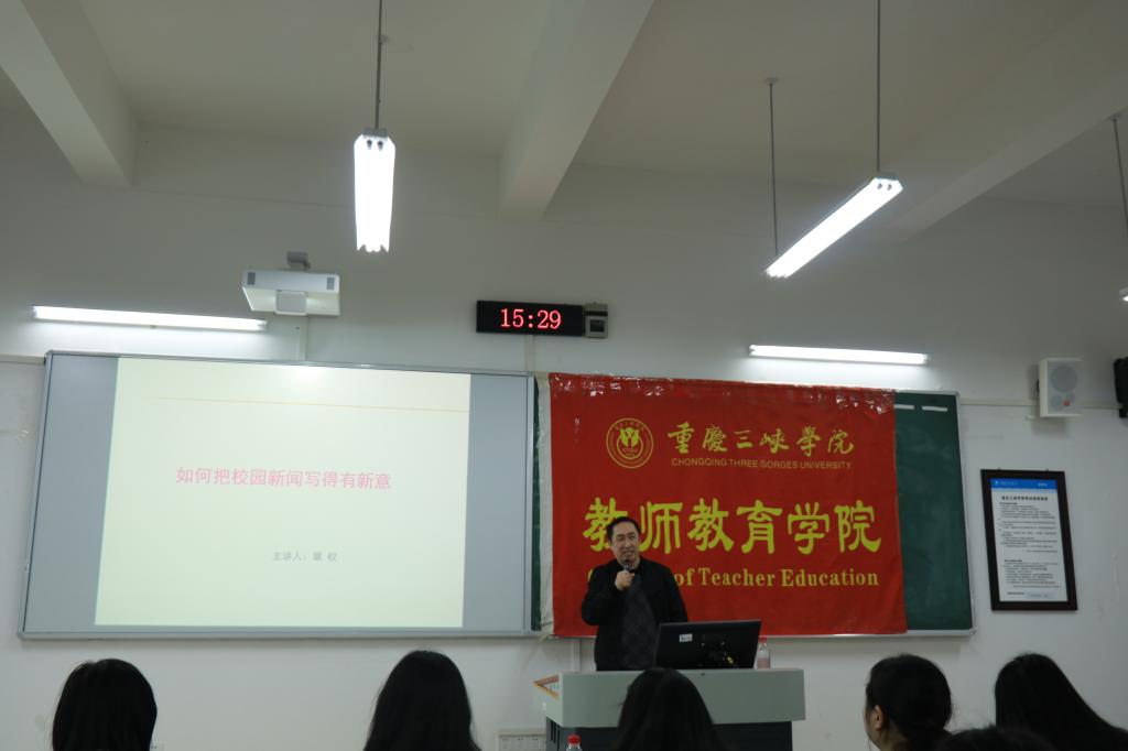 为进一步提高新闻写作质量,建设一支高水平的新闻写作队伍,2023年3月23日15:30,3044永利集团宣传部宣传科章权老师在博学楼1‐103为公司学子开展主题为“如何把校园新闻写得有新意”的写作培训。公司部分教师、员工会成员、各班员工代表参加培训会。