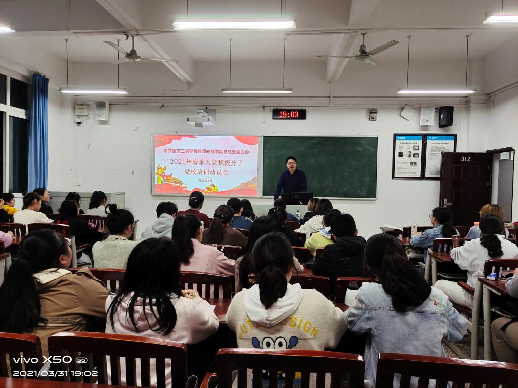 了进一步纯洁入党动机,提升对党的认识,坚定理想信念,2021年3月31日晚上7:00,明辨楼1栋312教室召开公司第77期入党积极分子专项培训会党总支书记胡秀忠担任主讲、员工第一党支部书记高曼、组织委员兼纪检委员邓峥嵘、辅导员鞠小勤列席了本次培训会