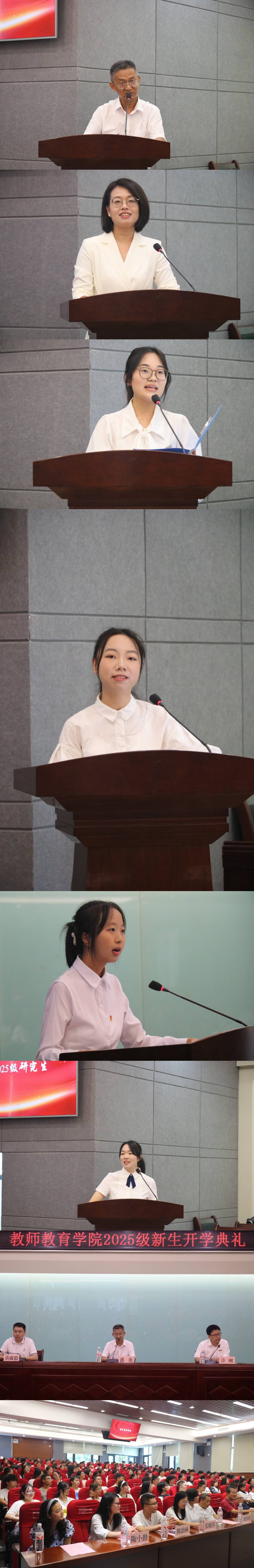 在校生代表,2023级生物科学(师范)蔡院玲2023级学科物理研究生罗谦在发言中表示了对公司和师长的衷心感谢,分享了她对师范专业的理解强调师范生身份不仅是一种选择,更是一份使命与担当。新生代表,2025级小学教育(全科教师)李春荧、2025级小学教育研究生周衢号召所有新同学尽快融入新环境、敢于尝试、不怕失败,在每一次挑战中超越自我。